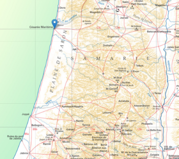 Siège du Proconsul. Ville construite par Hérode le Grand sur le littoral méditerranéen à 37 km au sud du Mont Carmel. C'était la résidence officielle des Hérodes et des procurateurs romains. Elle se trouvait sur la voie commerciale terrestre de Tyr à l'Égypte et possédait un port artificiel de 850m. Tout cela en faisait un important centre commercial. On y trouvait des palais et des bâtiments publics magnifiques, un immense amphithéâtre et un grand temple dédié à César et à Rome. La population était mixte, formée de Juifs et de Gentils. Le diacre Philippe était de Césarée et il y apporta l'Évangile[6]. C'est là que Pierre vit l'accomplissement de la vision où Dieu lui montra l'égalité des Gentils et des Juifs[7]; Paul, qui y passa plusieurs fois, y fut envoyé pour être jugé et y séjourna en prison pendant 2 ans.
