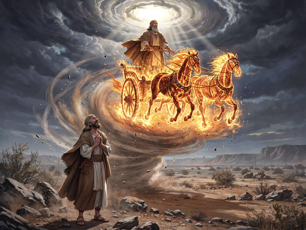 Enlèvement d'Élie sous le regard d'Élisée (2 Rois 2,11-12) interprétée par Mistral AI
